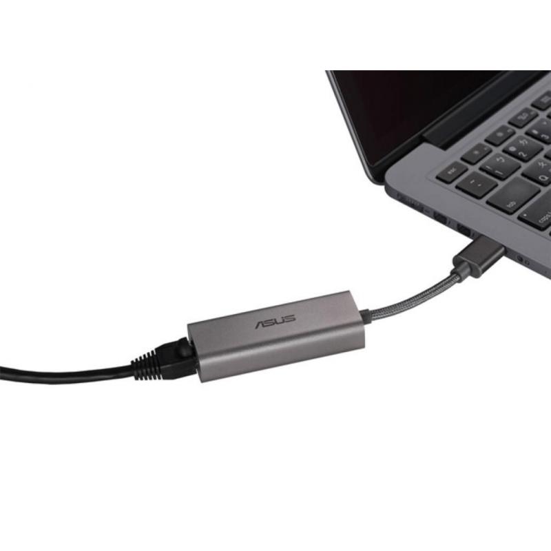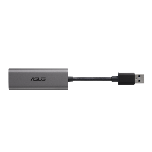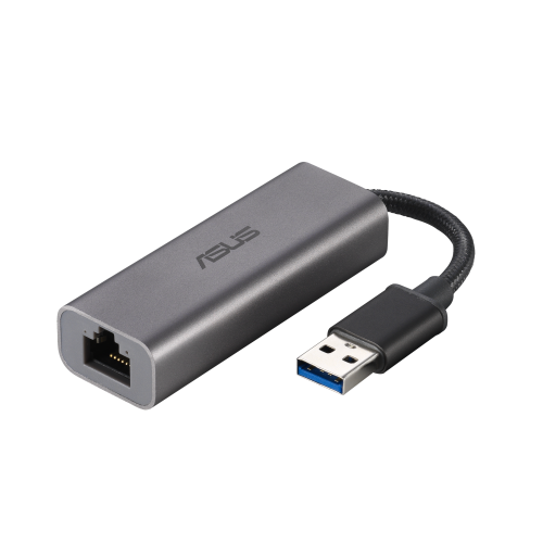 ASUS USB-C2500 Ethernet Adapter, Input USB 3.2 Gen1 Type-A, Output 100/1000/2500 Mbps RJ45 Port.
