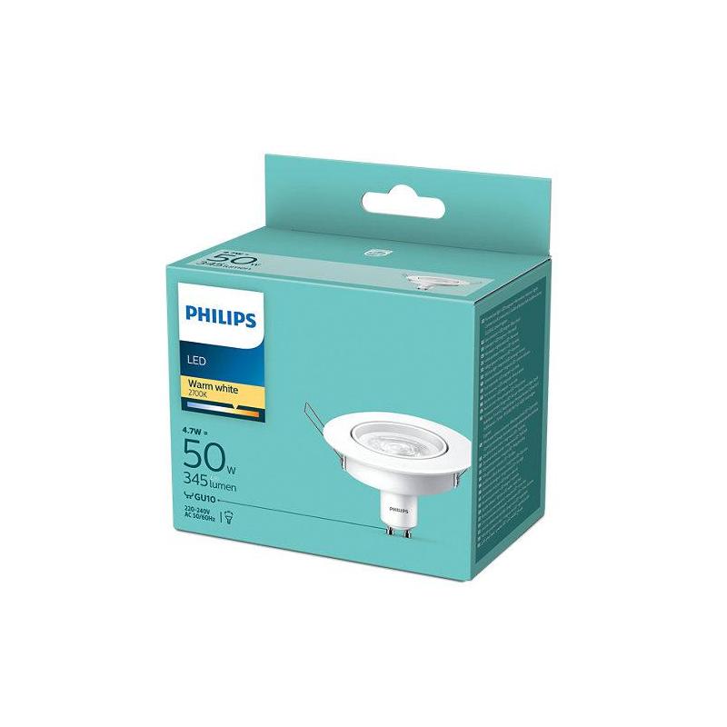Bec LED spot Philips, GU10, 4.7W (50W), 345 lm, lumina calda (2700K), 9cm, Alb