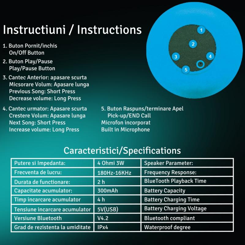 Boxa Spacer DUCKY-BK portabila, 3W RMS, control volum, acumulator 300mAh, microfon incorporat, incarcare USB, waterproof, negru