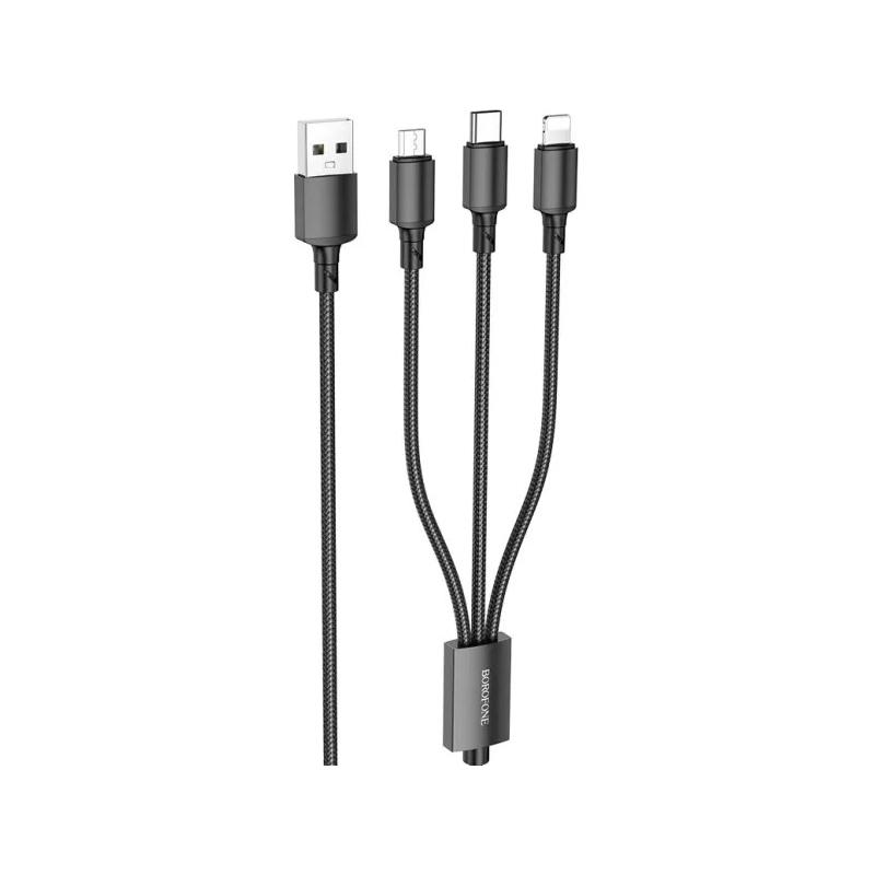 CABLU alimentare Borofone "BX72", pt smartphone,USB la Micro-USB+Lightning + USB Type-C 2A, 1m, brodat, negru "6974443384666"