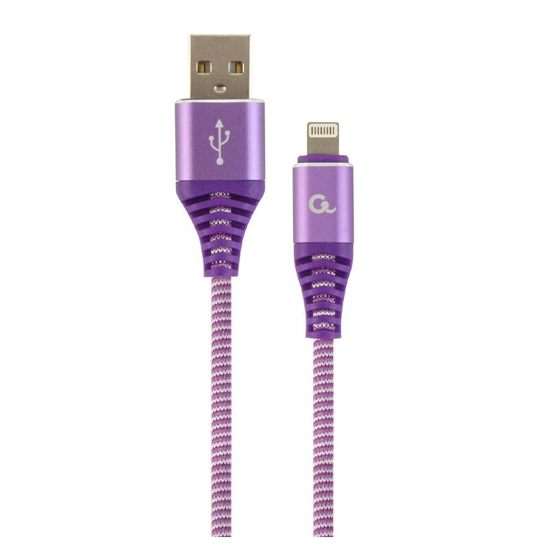 CABLU alimentare si date GEMBIRD, pt. smartphone, USB 2.0 (T) la Lightning (T), 2m, premium, cablu cu impletire din bumbac, mov cu insertii albe, "CC-USB2B-AMLM-2M-PW" (include TV 0.06 lei)