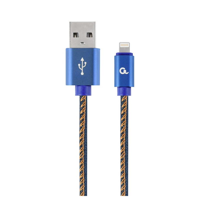 CABLU alimentare si date GEMBIRD, pt. smartphone, USB 2.0 (T) la Lightning (T), 2m, premium, conectori auriti, cablu cu impletire din bumbac, negru cu insertii galbene (Jeans model), conetori albastri, "CC-USB2J-AMLM-2M-BL" (include TV 0.06 lei)