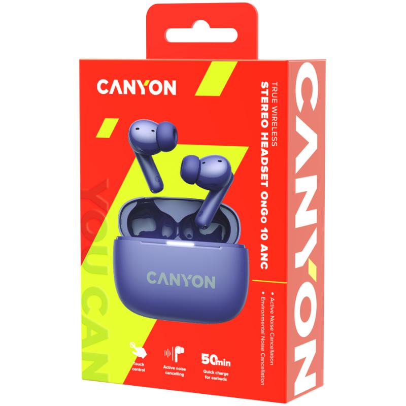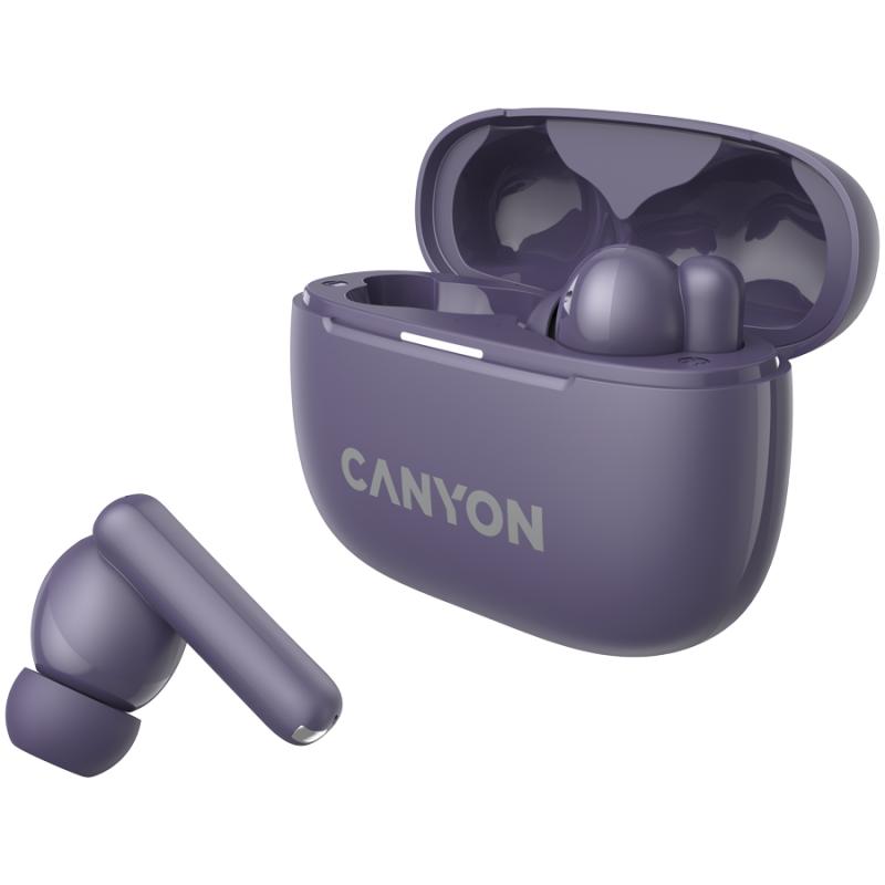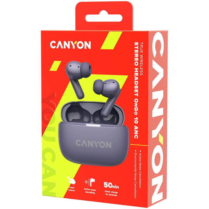 CANYON OnGo TWS-10 ANC+ENC, Bluetooth Headset, microphone, BT v5.3 BT8922F, Frequence Response:20Hz-20kHz, battery Earbud 40mAh*2+Charging case 500mAH, type-C cable length 24cm,size 63.97*47.47*26.5mm 42.5g, Purple