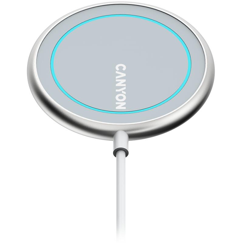 CANYON WS-100 Wireless charger, Input 9V/2A, 9V/2.7A, 12V/2A, Output 15W/10W/7.5W/5W, Type c cable length 1.5m, Acrylic surface+Aluminium alloy edge, 59*59*7mm, 0.06Kg, Silver
