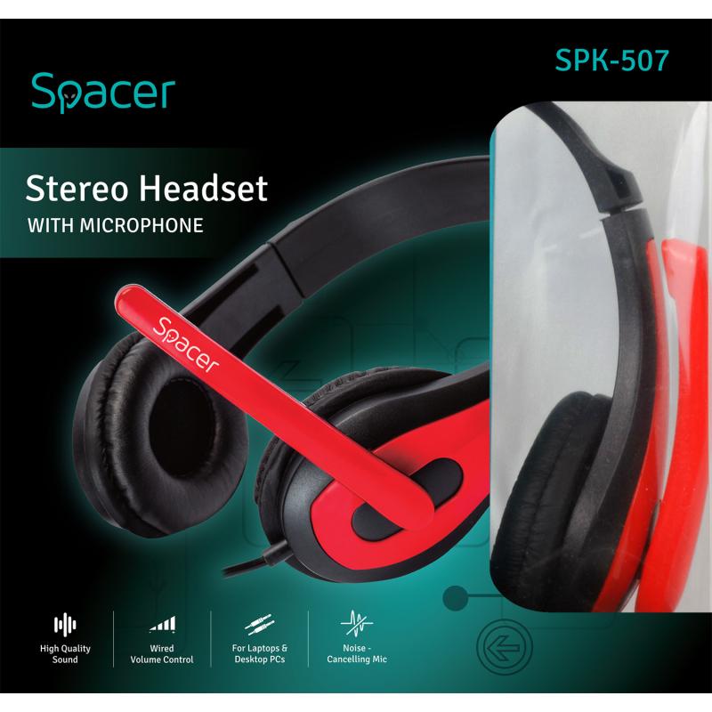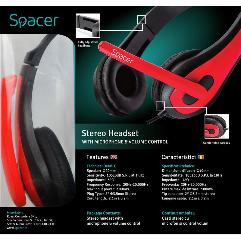 Casti cu micr. Spacer, cu fir, multimedia, 2x Jack 3.5mm, microfon pe brat, driver 40mm, 20Hz-20000Hz, 1.8m, rosu si negru