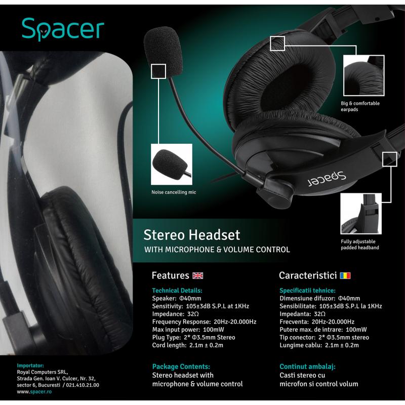 Casti cu micr. Spacer, cu fir, multimedia, 2x Jack 3.mm, microfon pe brat, driver 40mm, 20Hz-20000Hz, 2m, negru