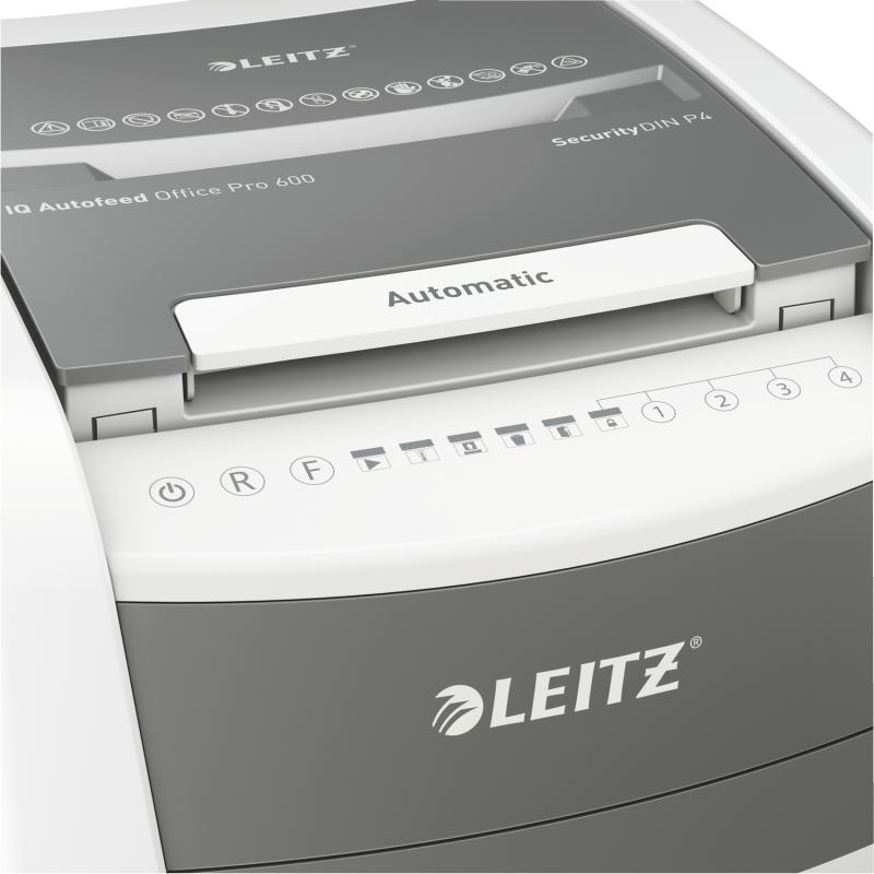 Distrugator automat documente Leitz IQ Office , 600 coli, P4, cross-cut (tip confeti), cos 110 litri, alb-gri, Leitz "80170000" (include TV 35lei)