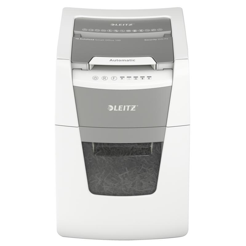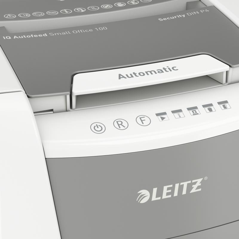 Distrugator automat documente Leitz IQ Small Office , 100 coli, P4, cross-cut (tip confeti), cos 34 litri, alb-gri, Leitz "80110000" (include TV 35lei)