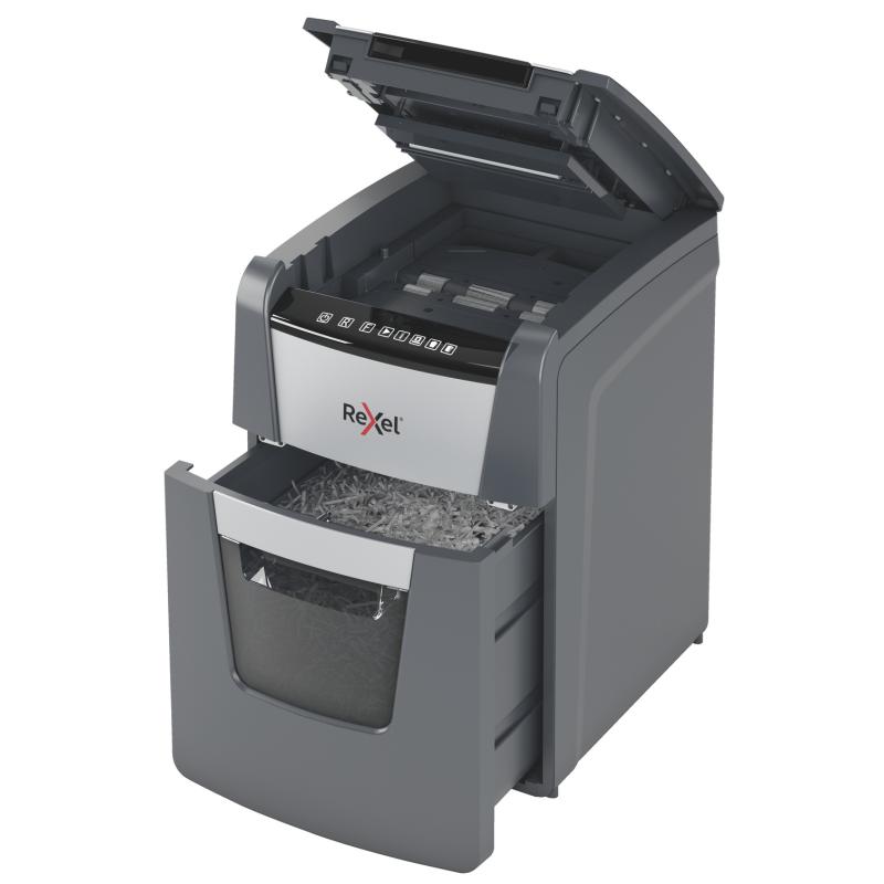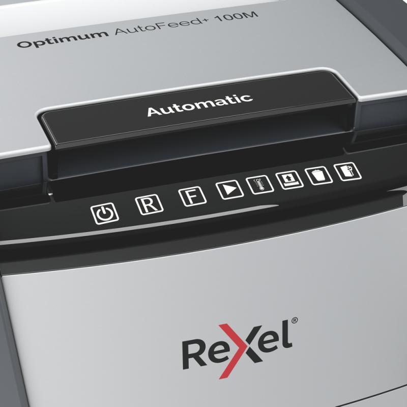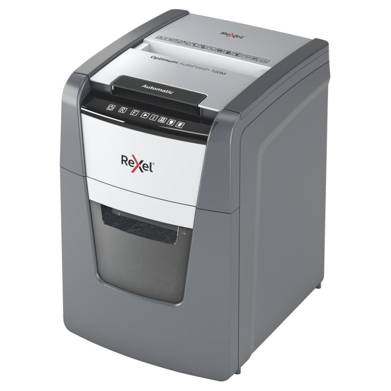 Distrugator automat documente Rexel OPTIMUM 100M , 100 coli, P5, micro-cut (tip particule), cos 34 litri, negru-gri, "2020100MEU" (include TV 35lei)