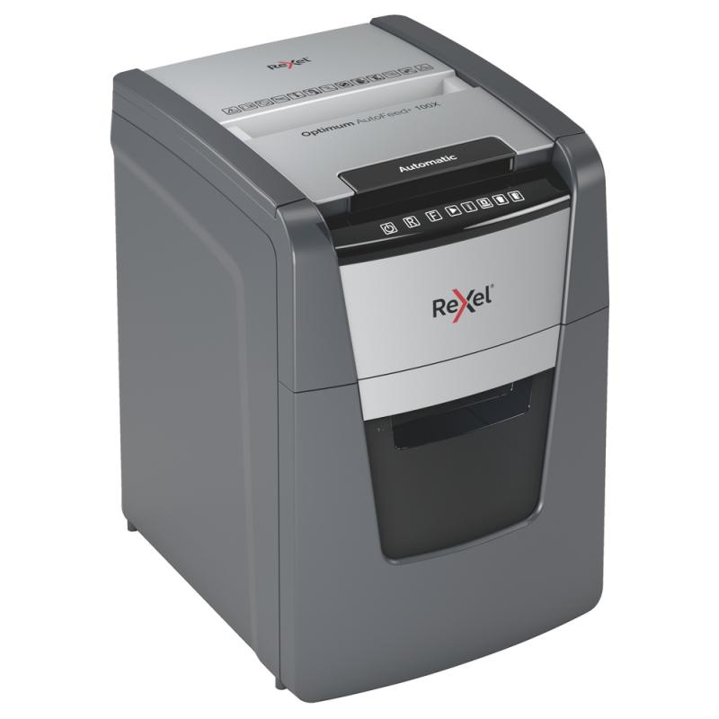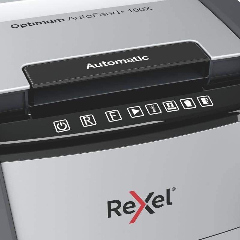 Distrugator automat documente Rexel OPTIMUM 100X , 100 coli, P4, cross-cut (tip confeti), cos 34 litri, negru-gri, "2020100XEU" (include TV 35lei)