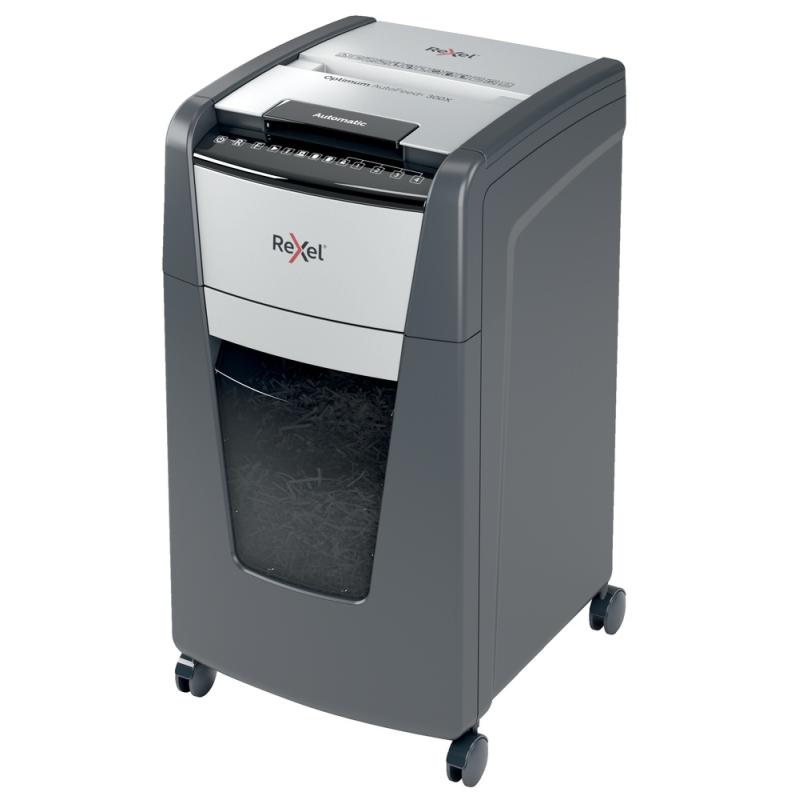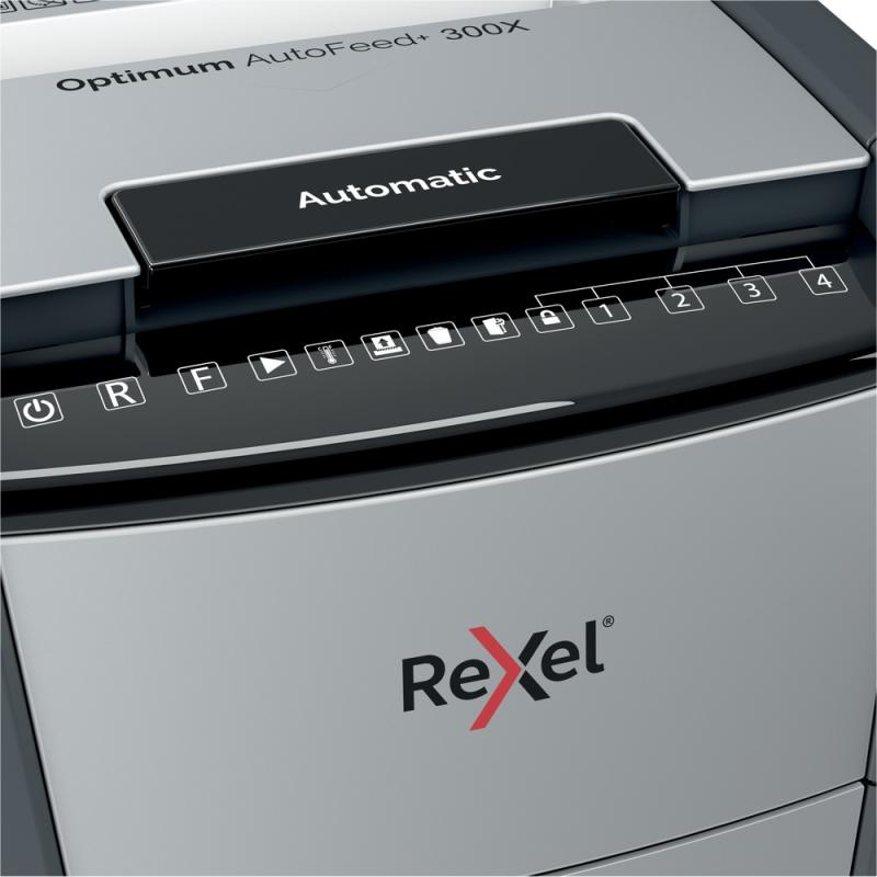 Distrugator automat documente Rexel OPTIMUM 300X , 300 coli, P4, cross-cut (tip confeti), cos 60 litri, negru-gri, "2020300XEU" (include TV 35lei)