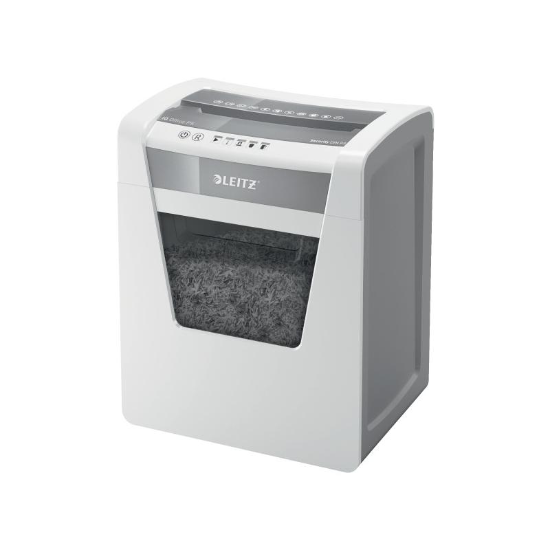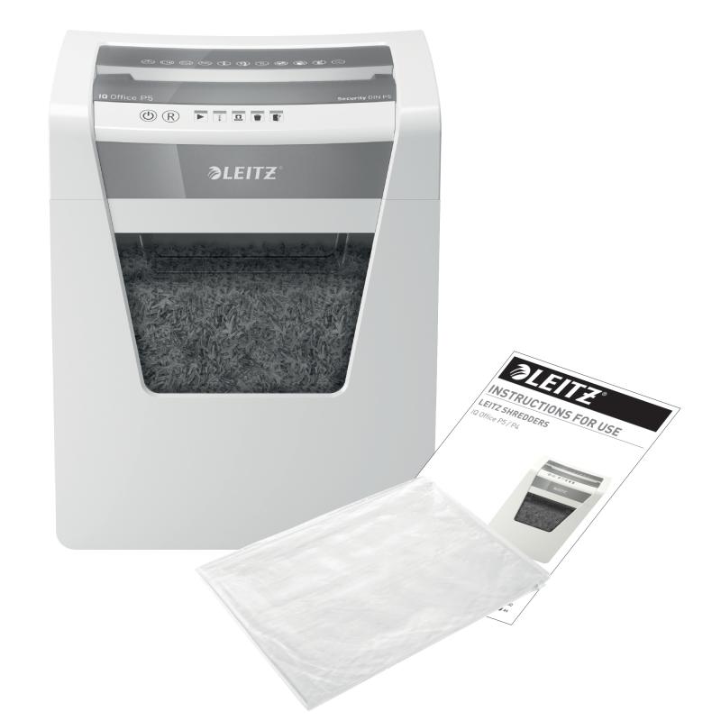 Distrugator manual documente Leitz IQ Office, 10 coli, P5, micro-cut (tip particule), cos 23 coli, alb, Leitz "80020000" (include TV 10lei)