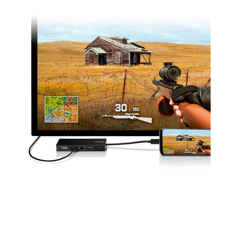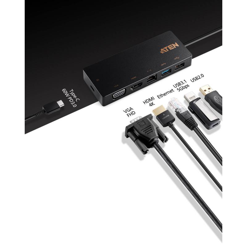 DOCKING Station ATEN universal, conectare PC USB Type C, USB 2.0 x 1, USB 3.1 x 1, porturi video VGA x 1, HDMI x 1, RJ-45, NB 60 W, negru, "UH3236-AT" (include TV 0.18lei)