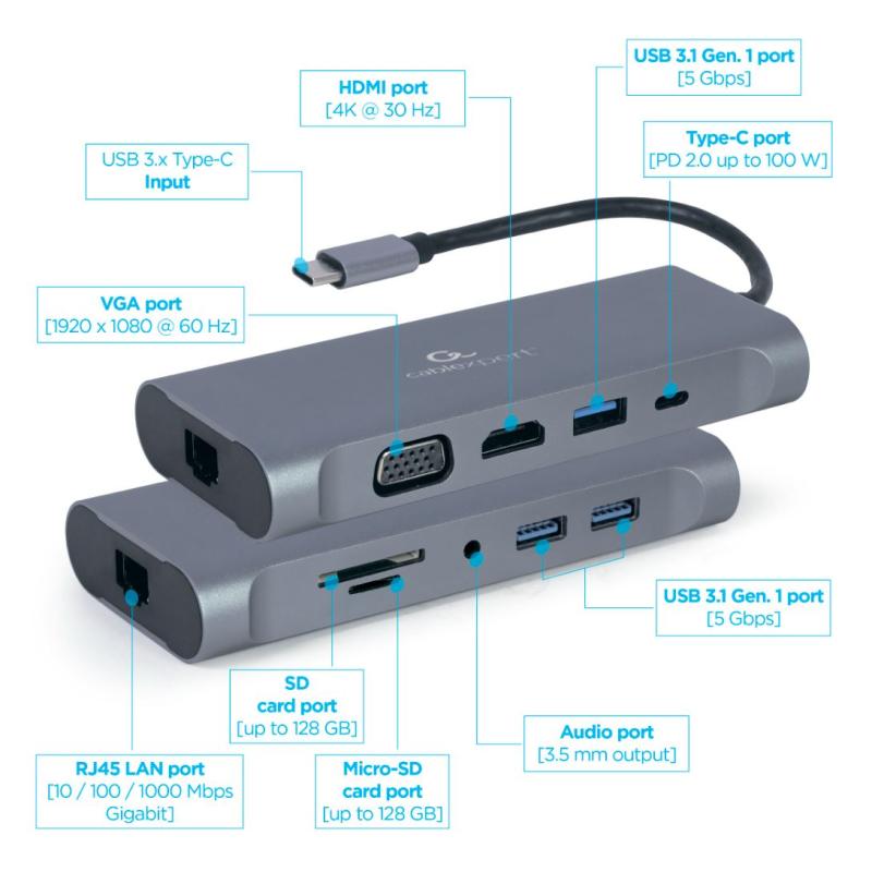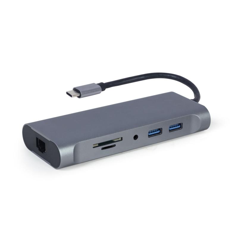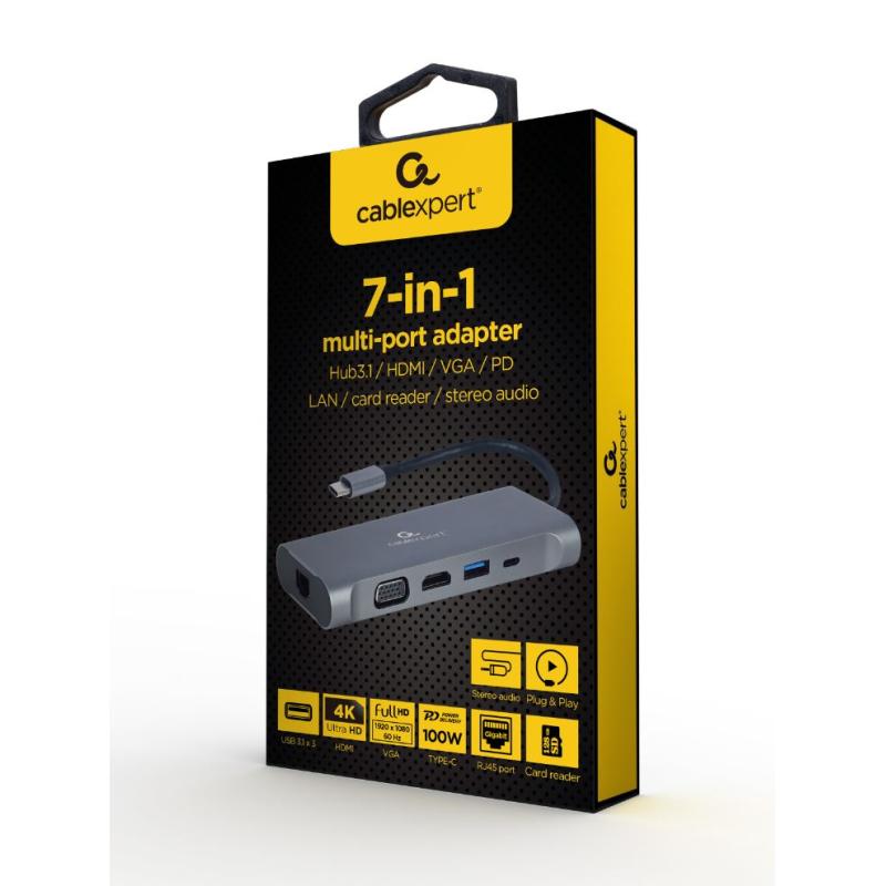DOCKING Station Gembird universal, 7-in-1, conectare PC USB Type C, USB-C x 1, USB-A 3.1 x 3, porturi video HDMI x 1, VGA x 1, RJ45 x 1, PD 100 W, SD, microSD, Audio, argintiu, "A-CM-COMBO7-01" (include TV 0.18lei)