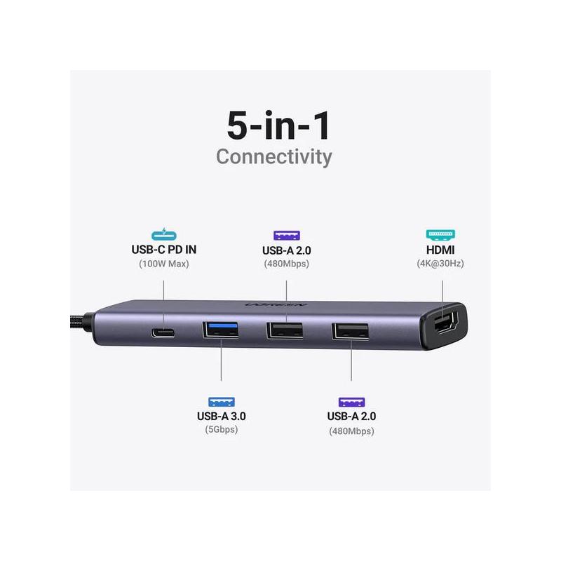 DOCKING Station Ugreen, "CM478" conectare PC USB Type-C, USB 3.0 x 1|USB 2.0 x 2|HDMI x 1/4K/30Hz|USB Type C x 1 PD 100W, aluminiu, gri "15495" -6941876214952