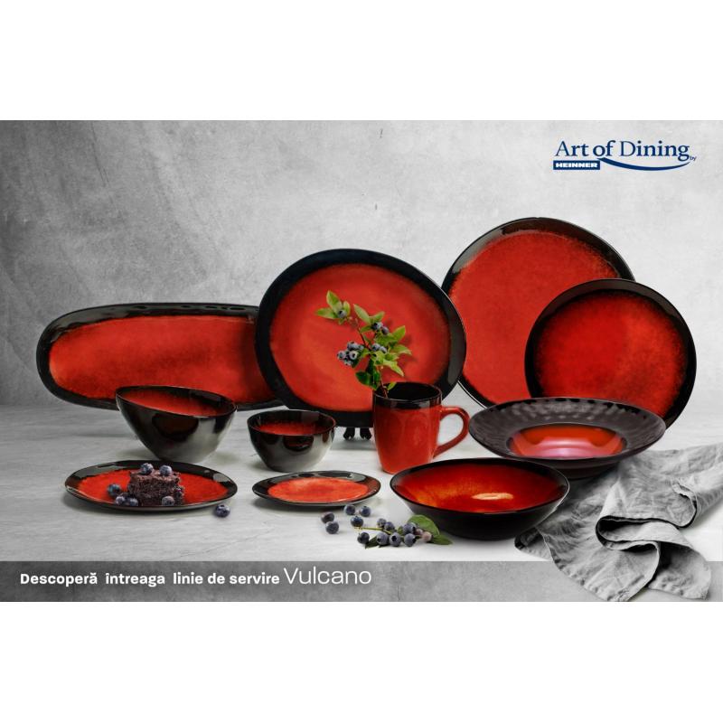 "FARFURIE OVALA CERAMICA 21 CM, VULCANO Lungime: 21.6 cm Latime: 18 cm Inaltime: 1.3 cm Material: ceramica Culoare: rosu cu efect (double reactive glaze red) Aspect lucios, glazurat interior/exterior"