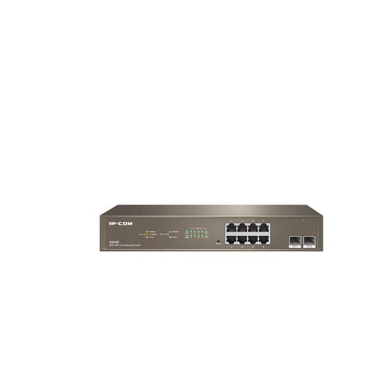 IP-COM 10-Port Gigabit Ethernet managed switch, G3310F; Network standard: IEEE 802.3, IEEE 802.3u, IEEE 802.3ab, IEEE 802.3x, IEEE 802.3z, and IEEE 802.1p/q/w/d, Interface: 8 x 10/100/1000Base-T Ethernet port, 2 x 1000Base-X SFP slot, Switching Capacity: