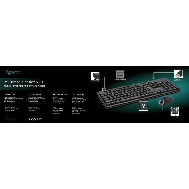 KIT Tastatura si Mouse Spacer SPDS-1691 cu fir, USB, tastatura multimedia „SPKB-169" + mouse optic „SPMO-M11", black, „SPDS-1691"