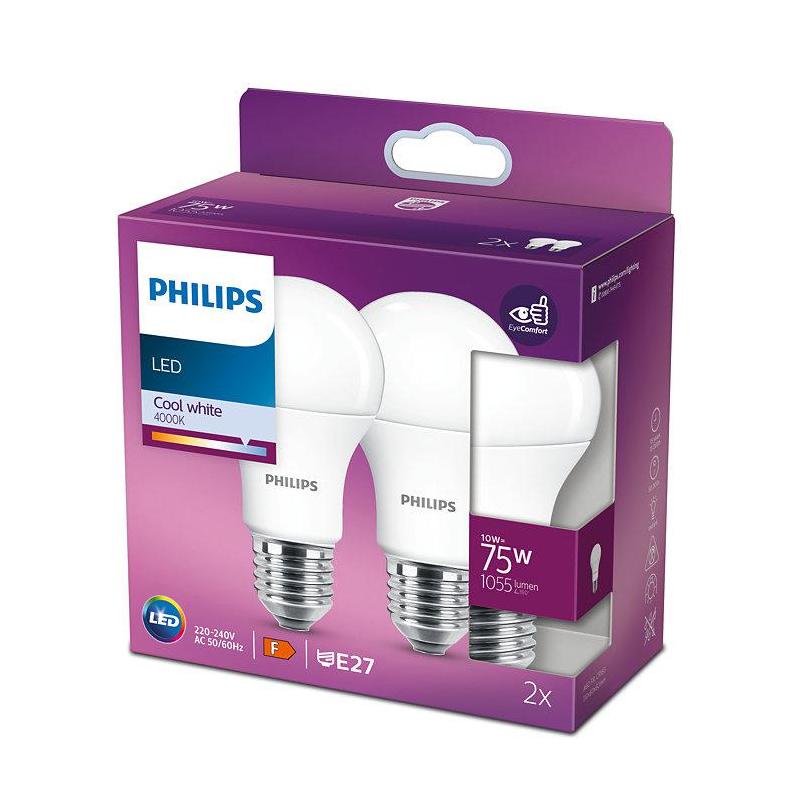 2 Becuri LED Philips A60, EyeComfort, E27, 10W (75W), 1055 lm, lumina neutra (4000K), mat