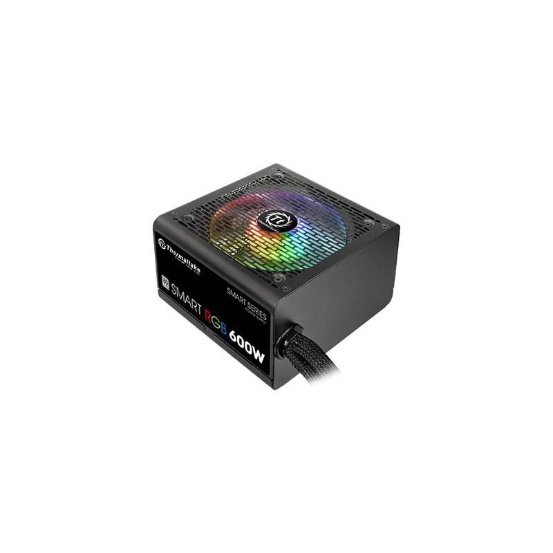 Sursa Thermaltake Smart RGB 600W iluminare RGB, certificata 80 PLUS, eficienta 82-86%, single rail (42A), ventilator silentios de120mm cu control termic automat, buton pentru contolul culorii de iluminare a ventilatorului (Red/Green/Blue/Yellow/Purple/Lig
