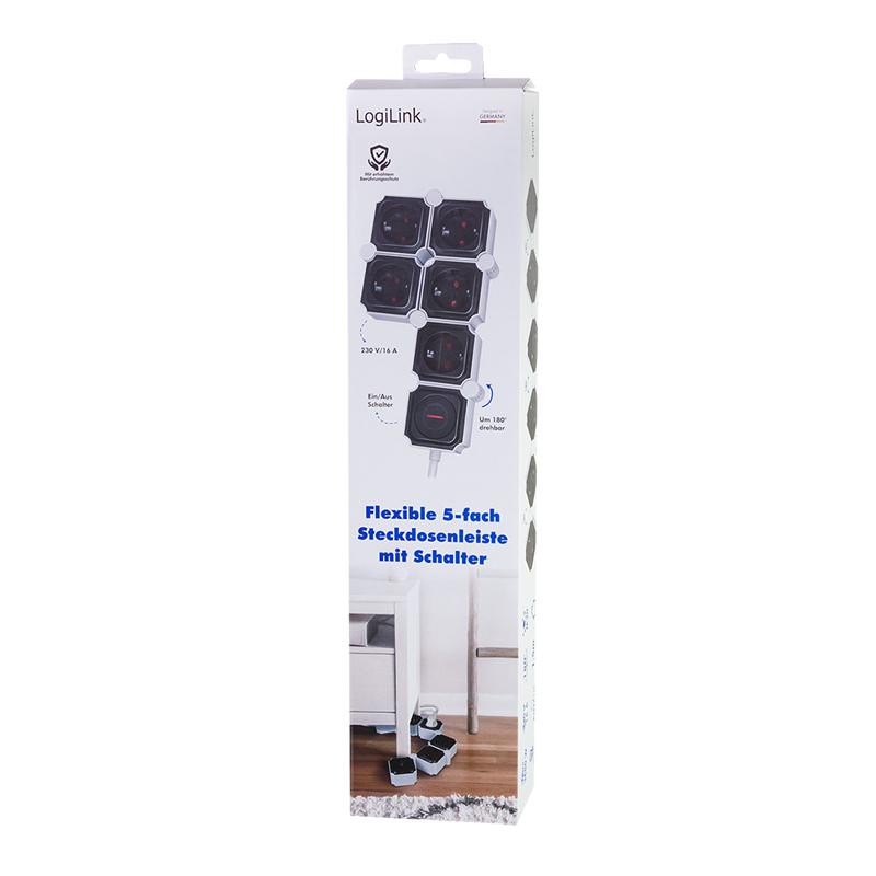 PRELUNGITOR LOGILINK, flexibil 180 grade, Schuko x 5, cablu 3G 1.5mm2, 230 V/16 A, 50 Hz, max. 3600 W, buton intrerupator iluminat, IP20, 1.5m, alb/negru "LPS277" (include TV 0.80lei)