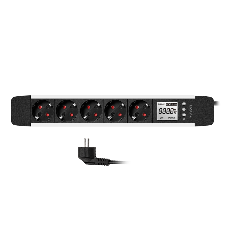 PRELUNGITOR LOGILINK, Schuko x 5, cablu 3G 1.5mm2, 230 V/16 A, 50 Hz, max. 3500 W, LCD consum, butoane: Power, Q, CO2, Reset, 1.4m, negru-argintiu, "LPS286"