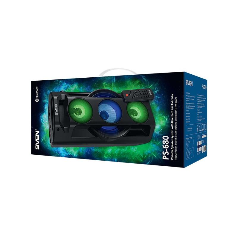 SVEN PS-680 2x32.5W; LED display; TWS; FM radio; AUX; USB/SD-card support;Lighting; Microphone input (karaoke); Remote Control; Built-in equalizer