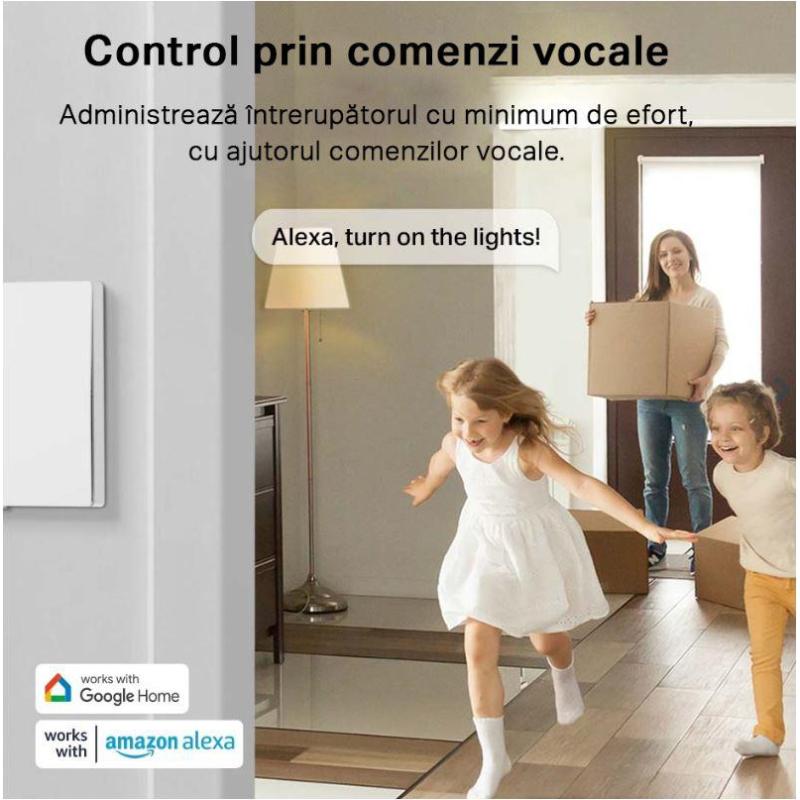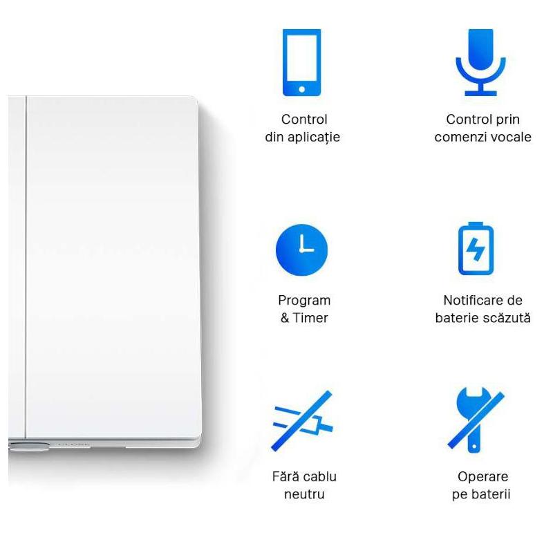 TP-LINK TAPO S220 intrerupator inteligent dublu (NECESITA HUB TAPO), Wireless: 868 MHz, incarcare maxima: 600 W LED/600W CFL/1000W INC/1000WFTL/Ventilator de 50 W, Dimensiuni: 87.1 × 86 × 41 mm, Alimentare: 2× Baterii AAA 1.5 V