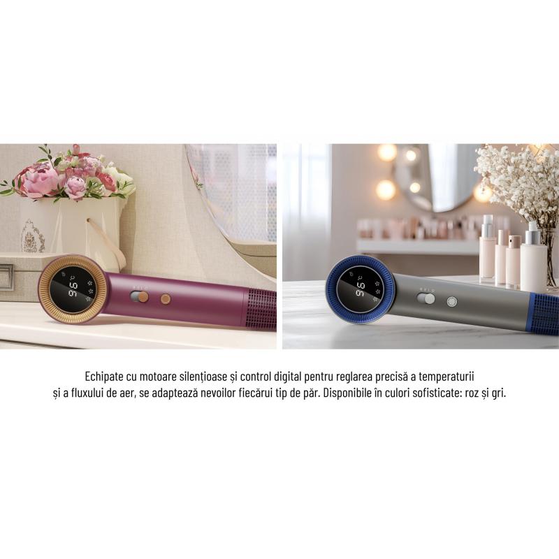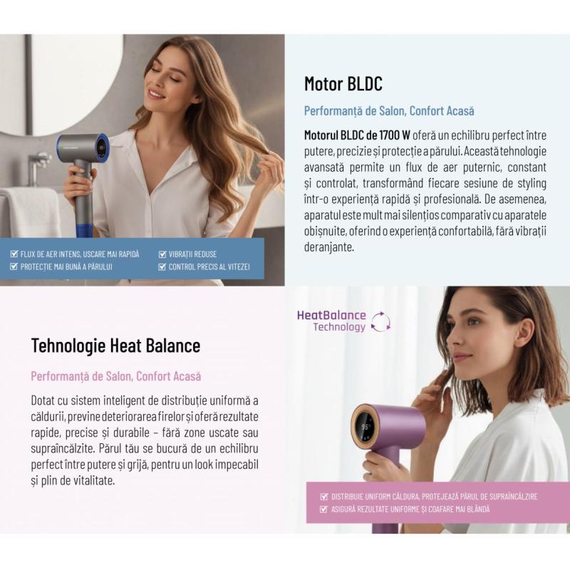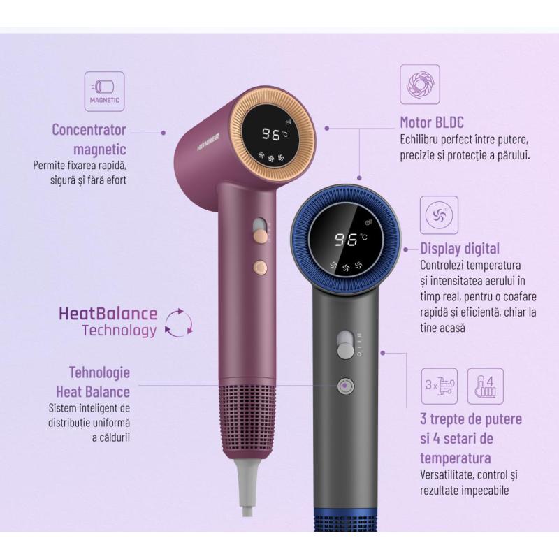 Uscator de par Heinner HHD-H17DBLDC-PP, ionizare, motor BLDC, putere: 1700 W, display, 3 trepte de putere, 4 setari de temperatura, concentrator magnetic, culoare: violet