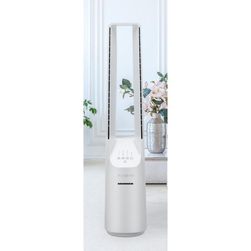 VENTILATOR TURN DIGITAL HEINNER HTFB-M33WH, TEHNOLOGIE CycloneFlow, DESIGN FARA PALETE, MOTOR DC, SENSOR DE TEMPERATURA, 6 VITEZE, 3 MODURI VENTILARE, RACIRE IN UNGHI DE 60 GRADE- PENTRU SUPRAFETE DE 8-10 M, SILENT <46dB (SLEEP MODE), TIMER 7H, FUNCTIE